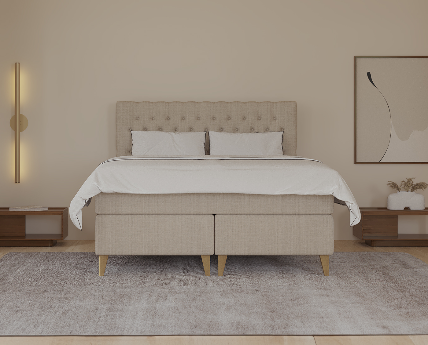 Mit einer Gesamthöhe von 49 cm ohne Beine bietet das Stuttgart eine ideale Einstiegshöhe. Die exquisite Verarbeitung und die hochwertigen Naturmaterialien im Bezug machen es zum Herzstück für anspruchsvolle Schlafumgebungen.